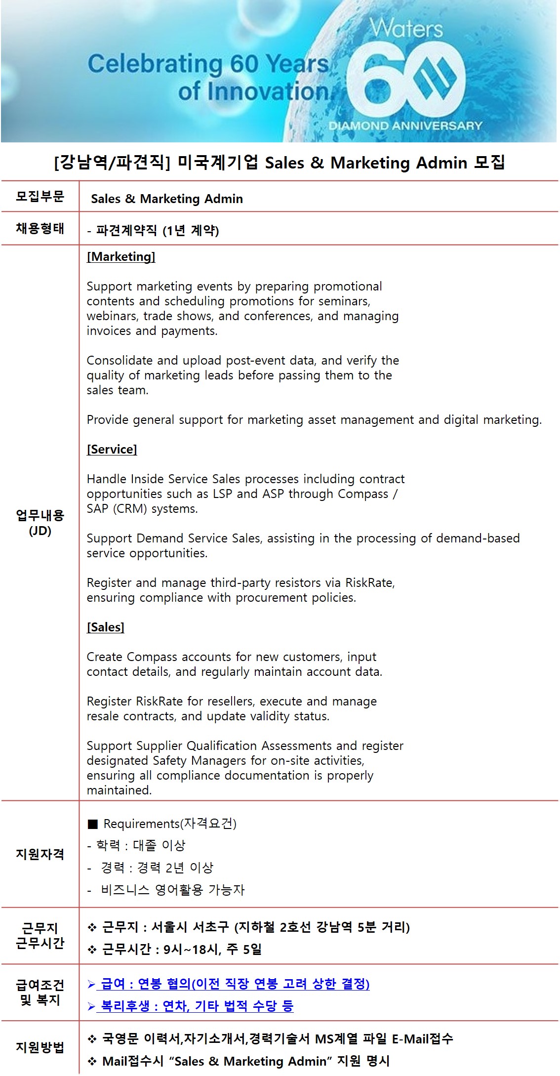 [파견직] 미국계기업 Sales & Marketing Admin 모집 [마감]