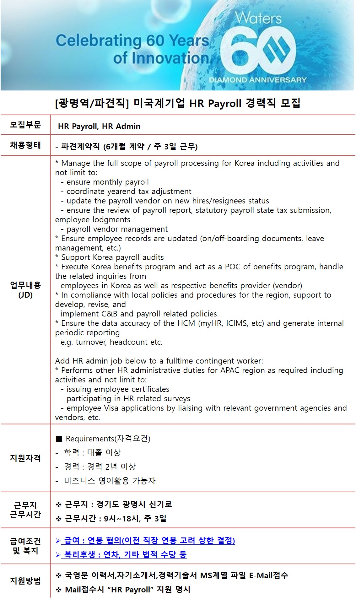 [파견직] 미국계기업 HR Payroll 경력직 모집 [마감]