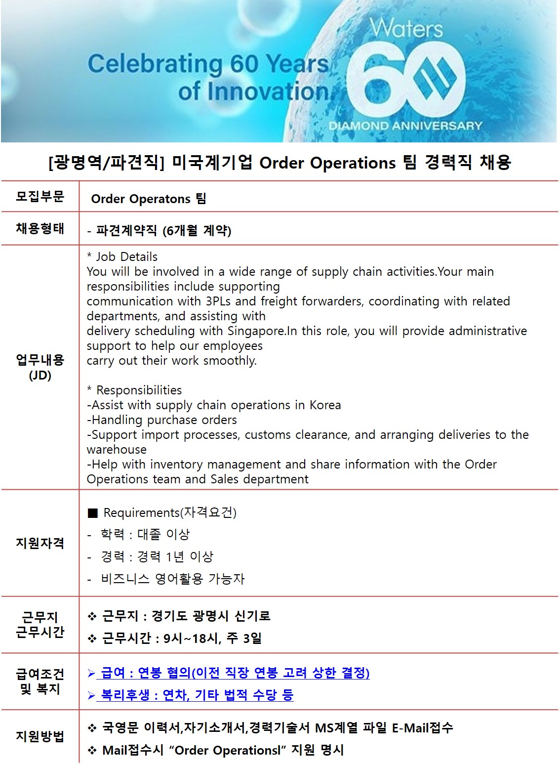 [파견직] 미국계기업 Order Operations 팀 경력직 채용