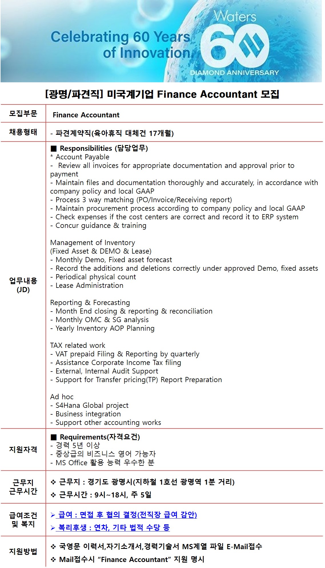 [파견직] 미국계기업 Finance Accountant 모집